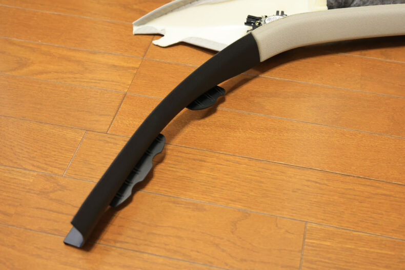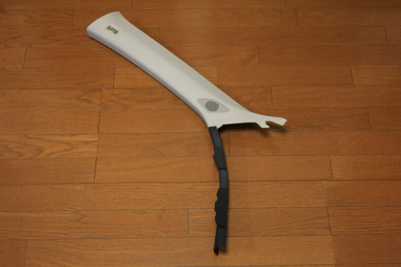 いきなりですがこれが外した内装です。スピーカーのあたりを中心に、上半分がグレー、下半分が黒になっていますが、この黒の部分まで一緒に外れることはネットではあまり公開されていないので、需要があると思いました。もちろんこうやって外してしまえばグレーと黒のそれぞれは分離できるのですが、車体に付いた状態では分離できず、この形で外す必要があります。