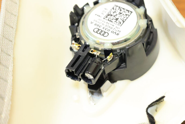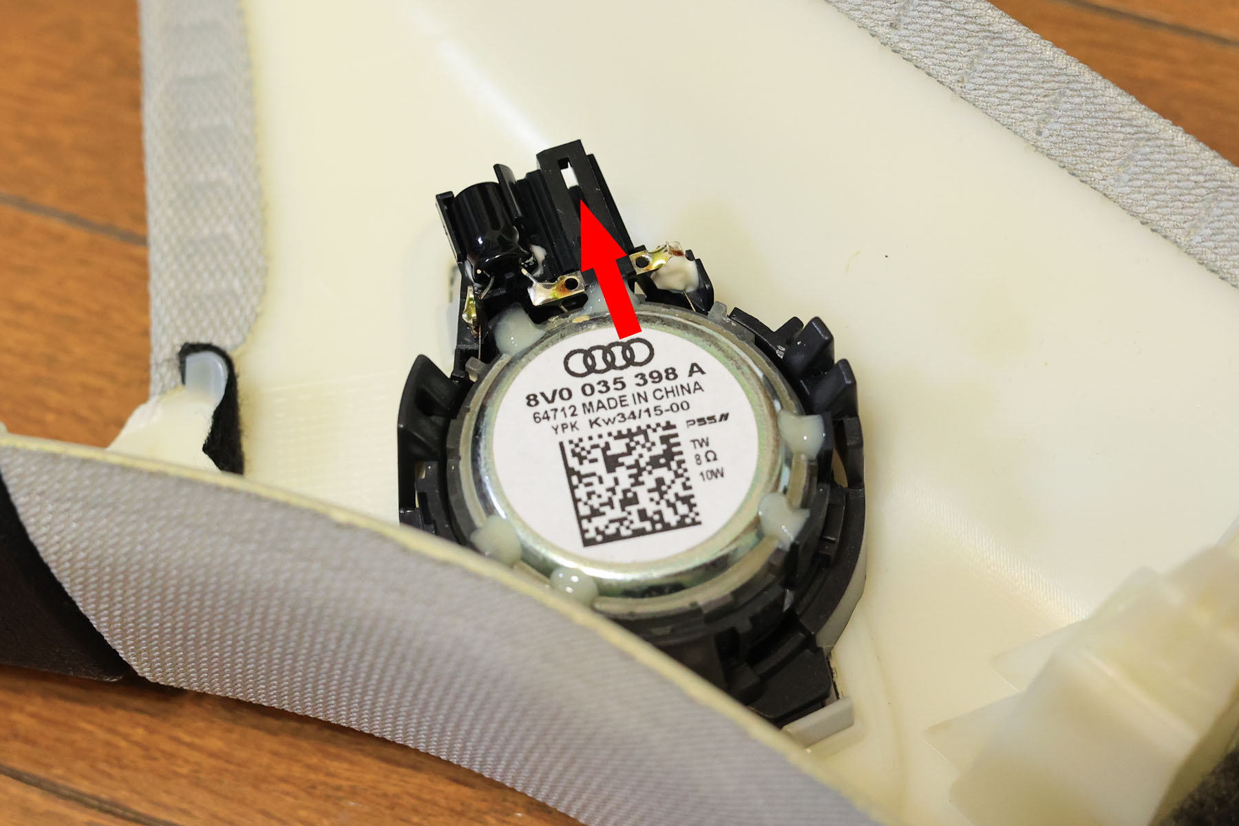 余談ですが、ツイーターなので電解コンデンサで低域分をカットしていますが、その電解コンデンサがちゃんとホルダーに収められていたのには感心しました。さすがAudiや…。もちろん万一の爆発方向もちゃんとピラーに内蔵されたエアバッグとは反対方向になるように設計されています。こういう地道な努力の積み上げが車全体としての信頼性の高さに繋がりますが、「そこ壊れるの?」という壊れ方をするのもまた外車の事実でもあります。
