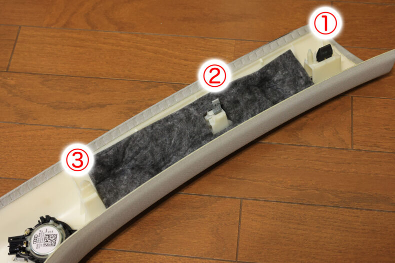 爪は3箇所あります。まず①の爪ですが、「AIRBAG」タグを外すと緩むようになっており、これは比較的外しやすいです。8V型A3でも、年度によってはここがトルクスネジになっていたという報告もあるようです。