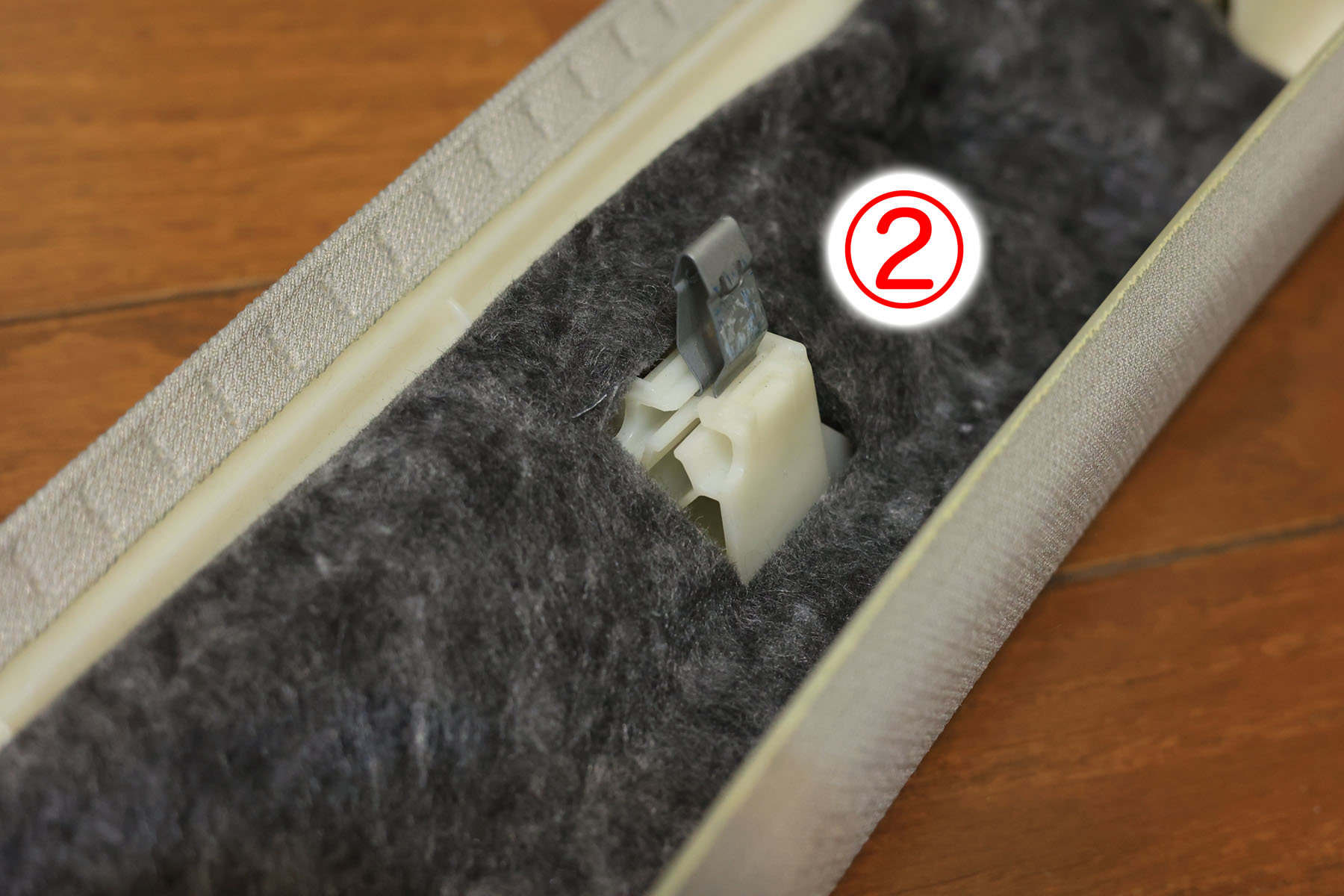 黒い部分の拡大写真。このように爪が2つ出ていて、これがグローブボックス側面のパネルに引っかかっていますので、Aピラー内張りを外す前にグローブボックス側面のパネルを外す必要があります。そのパネルの外し方は単純に内張剥がし出こじるだけで難しくないのでここでは割愛します。