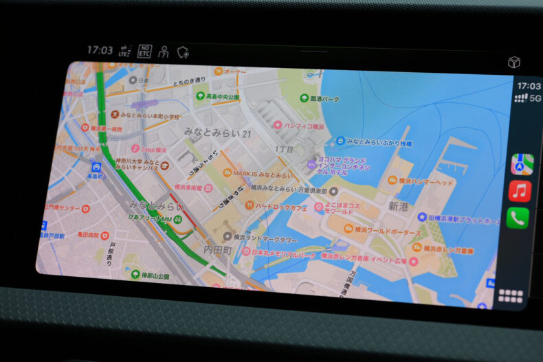 CarPlayでナビ画面表示するとこうなるんですよ。ナビがスマホ側でなく車体側に存在することのメリットもありますが、車体側カーナビはもう少し頑張らないとなぁ。