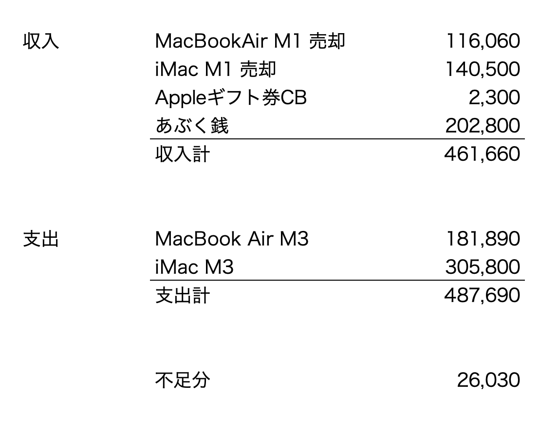 あぶく銭が入ったので、iMac M1 と MacBook Air M1 を売却して、iMac M3 と、MacBook Air M3を買いました。あぶく銭は放っておくとガッツリ納税しないといけませんからね。経費で使ってしまった方がいいです。