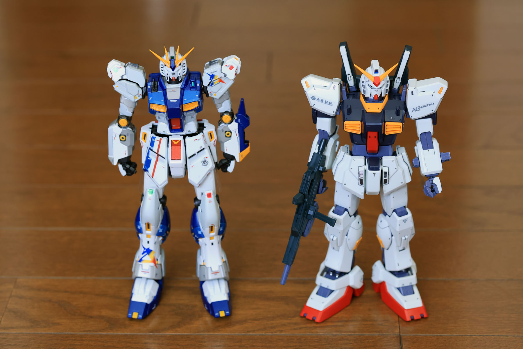 なんか思ったより大きいなぁと思いまして、近くにあった1/100 RX-178と比較してみました。だいたい1/100スケールでしょうか。てっきり1/144くらいかなと思っていたのでちょっと驚きました。