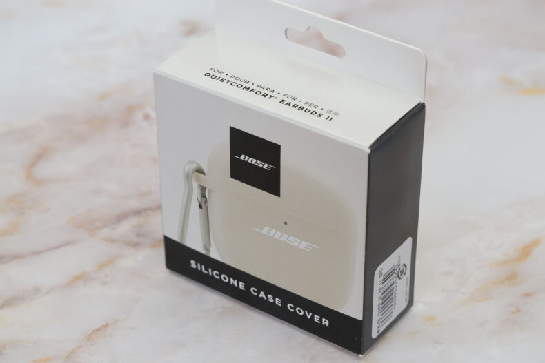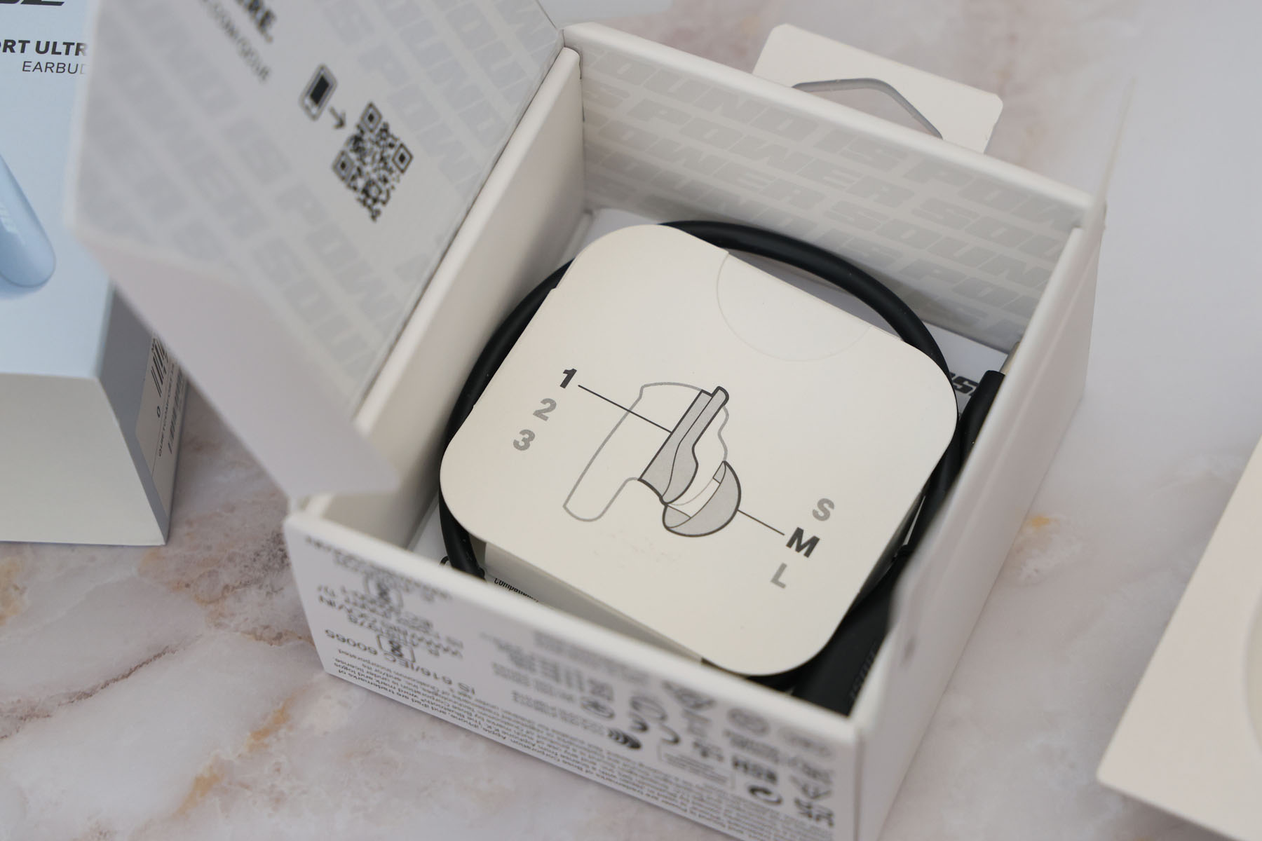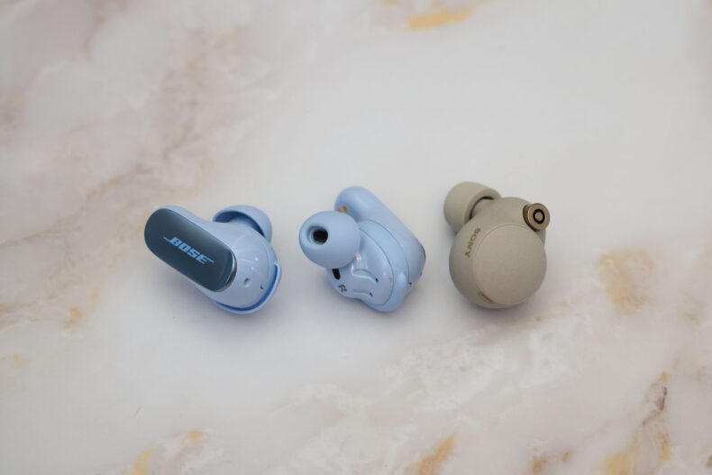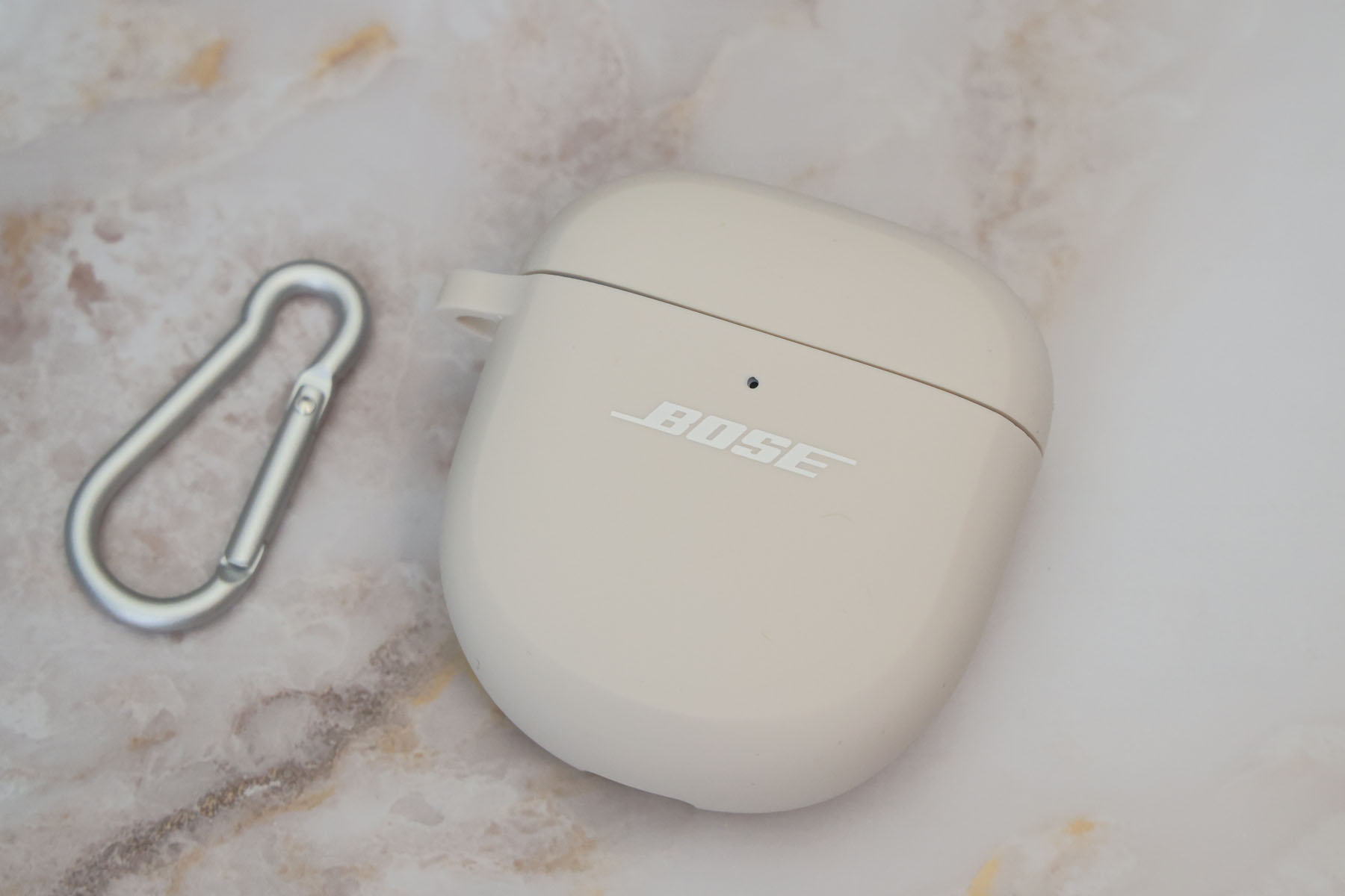 大きさは WF-1000XM4よりちょっと大ぶりかなという印象。ただし耳から出っ張る方向ではなく、顔の形に沿った方向で大きいので邪魔ではありません。なおBOSE独自の形状で耳のくぼみに引っ掛けるので、落ちにくさは WF-1000XM4 と遜色ありません。また、イヤーピースの穴が楕円状なので、サードパーティの汎用イヤーピースは使えません。
