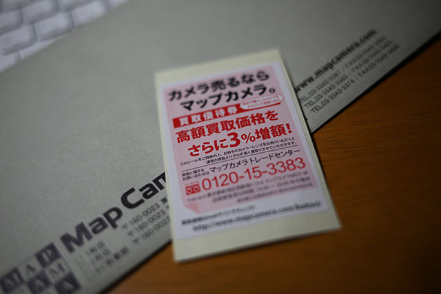 「お客様、以前マップカメラでお買い上げになったことはございませんか?その際に同封させて頂いた灰色の封筒の中に、買取優待券が入っております。それは+10%と併用できますので…」
