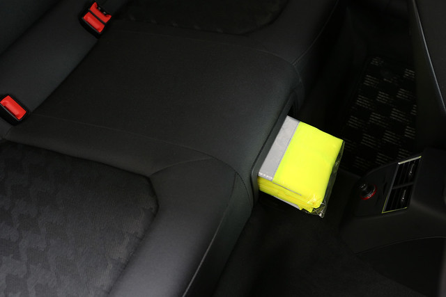 ディーラーから説明を受けたのはこの装備。リア中央席の下に、何やらポケットがあります。