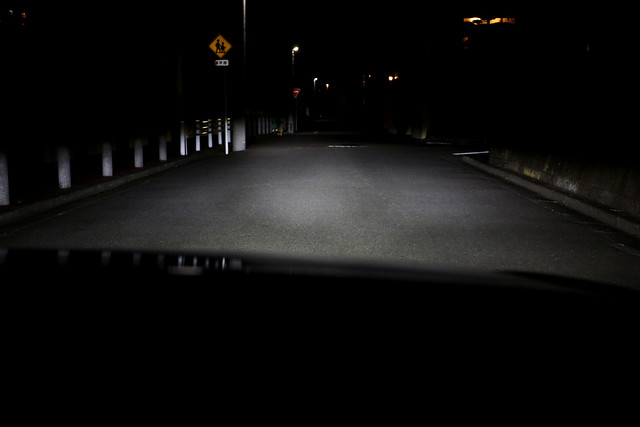 ただ、肝心のヘッドライトとしての性能ですが、明るさはともかく、配光ムラがひどいです。上の写真はLEDヘッドライトで照らした路面ですが、明るいところと暗いところがあるのがお分かり頂けるかと思います。設計自由度が高いはずの次世代のヘッドライトとしてはあまりにもお粗末と言えるでしょう。