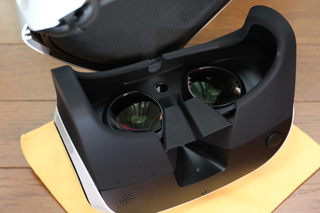 HMDの接眼レンズ部。目の間隔を調節するような機構は見あたりません。(あとで判明しましたが、目の間隔の調整が必要な場合は、PS4本体の方でソフトウエア的に調節する仕組みが入っているようです。)