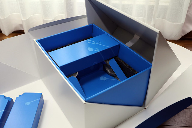 外側の青い箱は開くと箱状ではなく、包み紙のように展開します。中から白いボール紙の箱が現れます。
