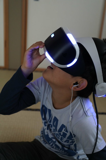 早速ムスコにプレイさせてみました。12歳以下は視力の発達に悪影響があるといわれており、使用禁止ですが、まぁ家の中にこんなものがあったら興味を示さない方が無理だと思うので、少しの時間やらせてみました。結果、DRIVE CLUB で VR 酔いしたようです(ぉ
