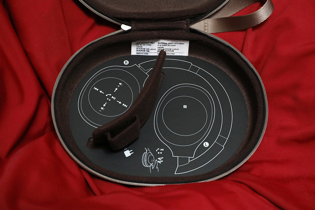 ケースの底には収納法も描いてあるのが親切。同梱のエアラインアダプターを収納するポケットも仕切り板に付いています。あれ?でもワイヤードで使う場合のケーブルはどこに収納するの…?