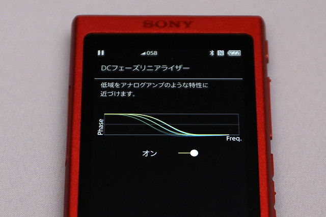 昔のウオークマンには搭載されていなかった「DCフェーズリニアライザー」は面白いですね。これはアナログアンプで原理的に生じる「超低域の位相が早いほうにずれる」現象を意図的に生み出すことで、アナログアンプを前提として音作りしたソースでの再現性の向上を目指すものです。上位機種だとこのDCフェーズリニアライザーの効果を何段階かに切り替えられるようなのですが、本機では1段階のみ。効果は曲のジャンルによってはとても分かりにくく、そういう意味でもマニアックですね。そもそもそのソースがアナログアンプ前提で音作りされているかどうかなんて知る由もないし(笑。実際は聴感上の好みで使うことになるでしょうか。