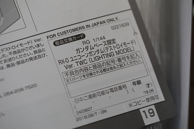 本日発売の「RG 1/144 ガンダムベース限定 RX-0 ユニコーンガンダム(デストロイモード) Ver.TWC(LIGHTING MODEL)」を買ってきました。