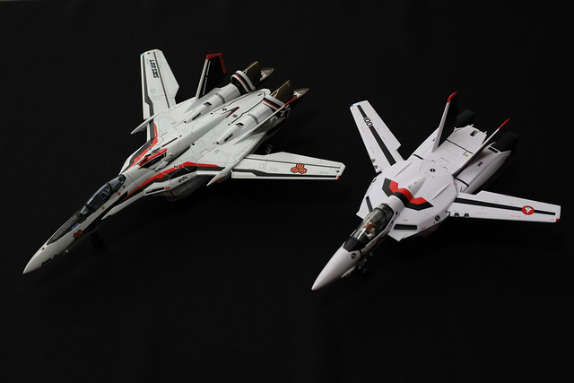 右がアルカディアのVF-1S。カラーリングは劇場版です(TV版にはストライクバルキリーは出てこなかったのでストライクといえば自動的に劇場版ですが)。スケールは1/60ということになっています。左はDX超合金のVF-25F。NTS(Not to Scale)ですが、見た感じ概ね1/60でしょう。VF-1Sが全長14mで、VF-25Fが18mなのでざっくりこんなものです。