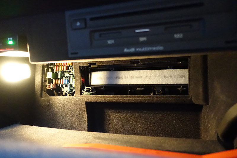 8V型のA3は8P型と違ってそんなに無理な姿勢を強いられることなくエアコンフィルターを交換できます。グローブボックスの奥にあるフタを取り外すと交換できる仕組みになっています。これはありがたい。