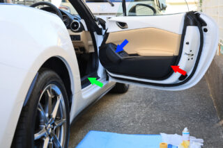 貼りものはまだ続きます。赤矢印、ドア内張下部のキックガード(靴による傷防止)と、青矢印、ニーパッドを貼りました。キックガードはハセプロの MHL-KGMA5ですが、特に問題なく貼り付けでき、違和感もありません。ニーパッドは当初取り付け予定は...