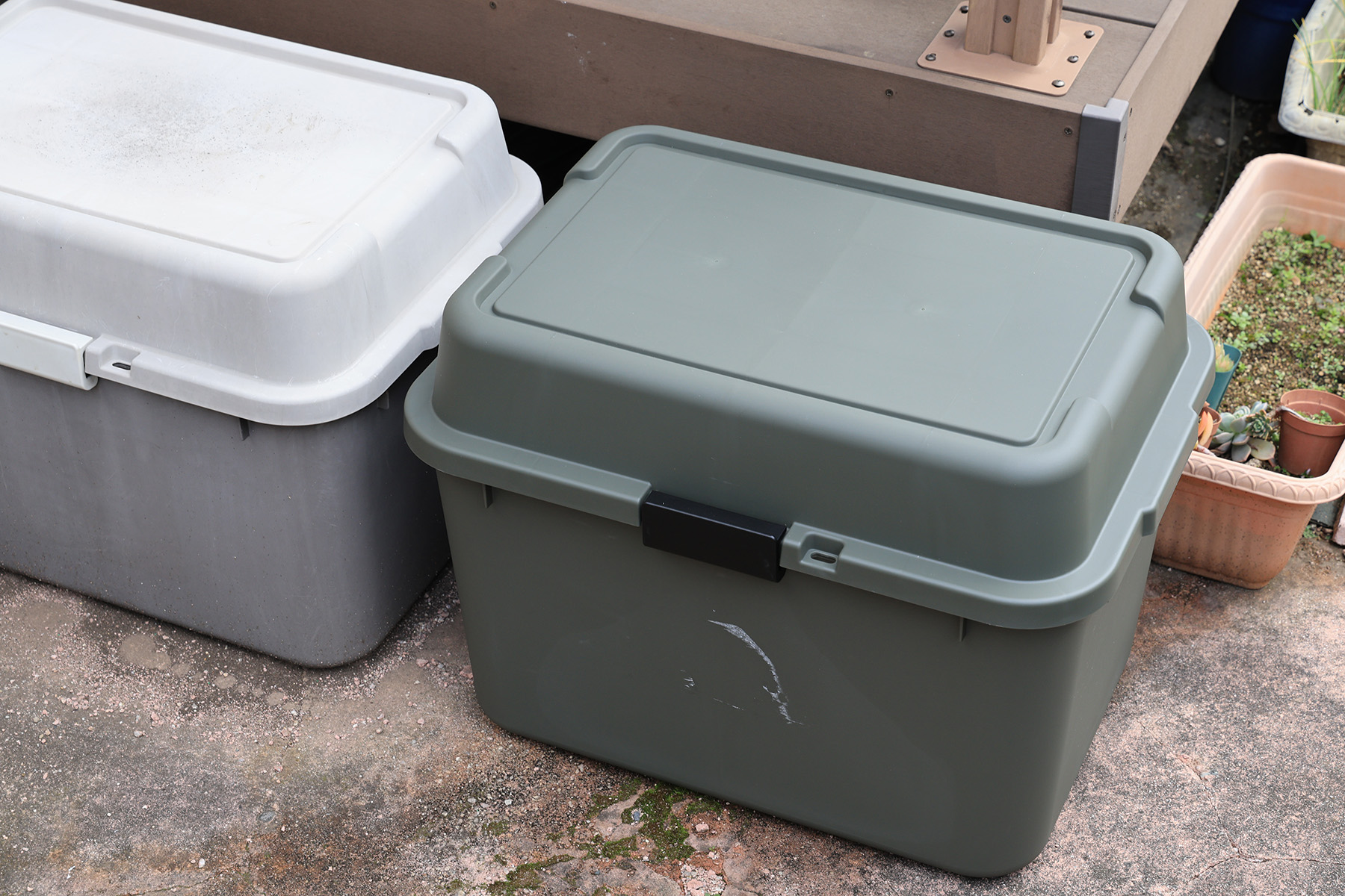 買ったのはこのオリーブグリーンの方で、左に見切れてるのが今まで使っていた散水ホース収納用ボックスです。色違いでモノとしては同じですね。ただ、前面に貼ってあった製品ラベルがとても剥がしにくく、写真のように薄く剥がれたラベルが残ってしまいました。表面のシボ加工の凹凸の高さより薄い厚みで残ってしまっているのか、スクレイバーで擦っても引っかかりません。まぁ普段見ないところだし、直射日光に1年も当たればボロボロになって崩壊するだろうと期待して、深追いせずこのままにします。さすが製品自体が安いだけあって、ラベルは原価の安い、綺麗に剥がれるかどうかなんてケアしていないものを使ってるんでしょうね。