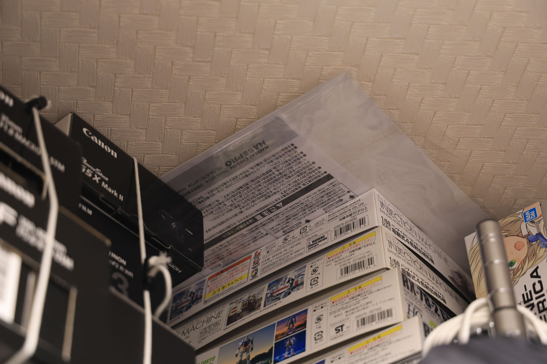 まだ納車まで50日以上あるので、置いとくところも困りますが、とりあえずガンプラと天井の隙間に入れておきました。