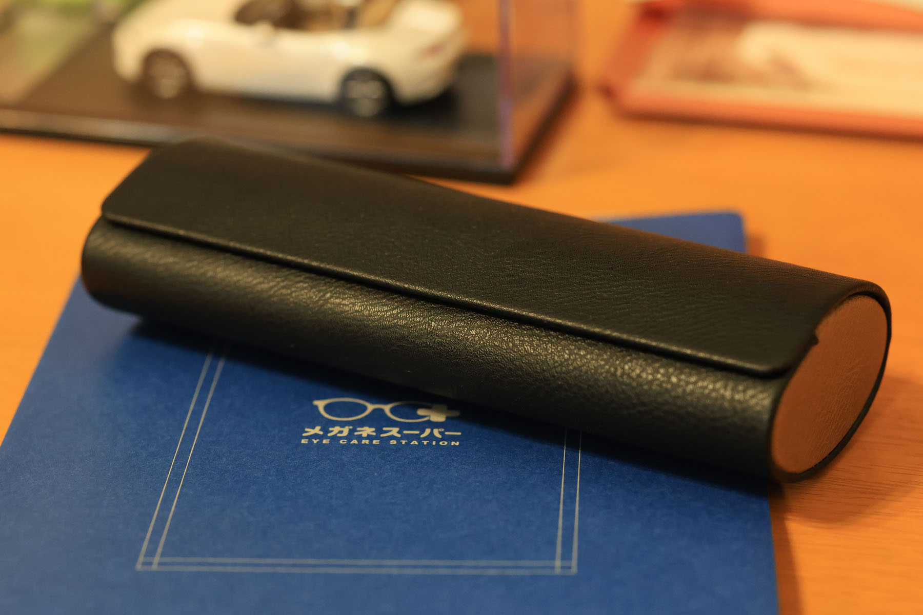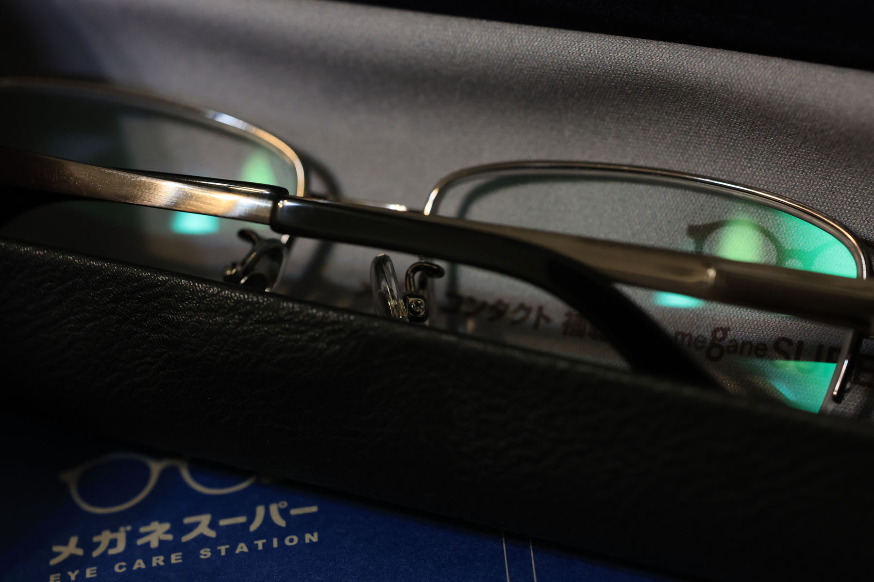 無料でつけてもらえるメガネケースはたまたま引き取りに同行した娘のチョイス。黒の外皮+ブラウンの側面+ネイビーの裏地、そこにメガネ拭きはグレー。完全に娘の普段の色使いです。
