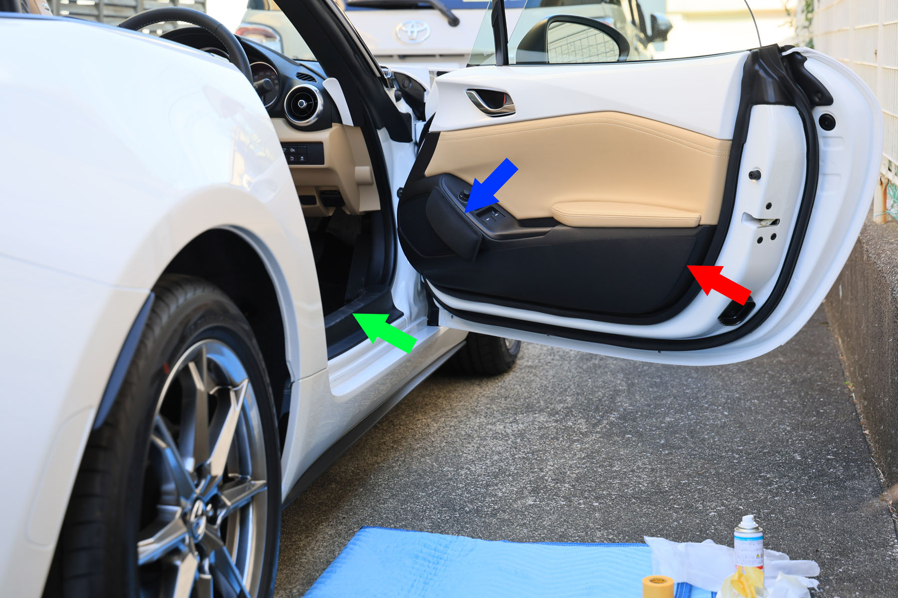 さて、キックガードは取り付けましたが、地味に一番足を擦っているのは緑矢印のサイドシルのところだったりします。オープンカーのボディ剛性を高めるのに、このサイドシルの高さが高いんでしょうね。ここはまだ良い部材を見つけられていません。ぶつけるのではなく横に擦る方向に力が加わるので、どういうものがいいかなぁと思案中です。案外何もしないかもしれませんが。