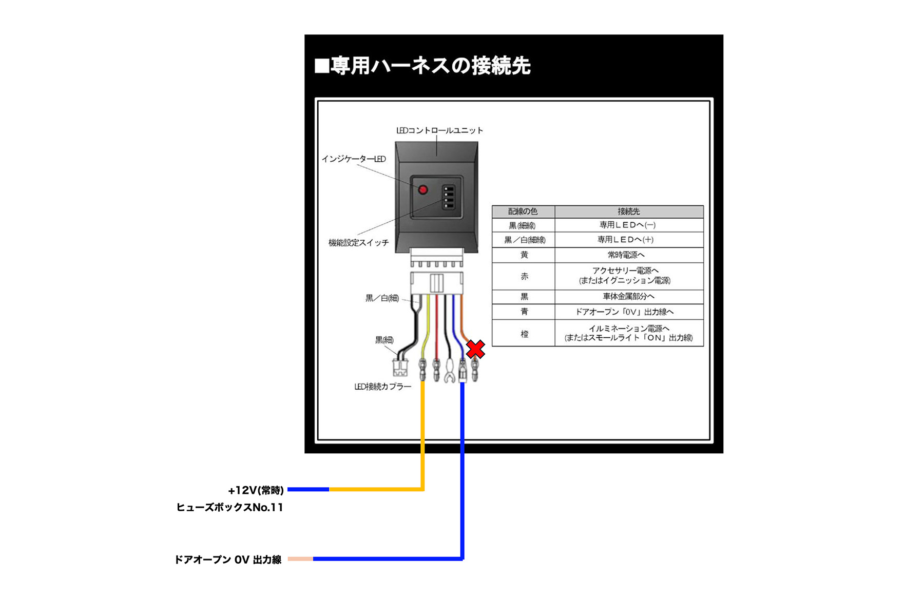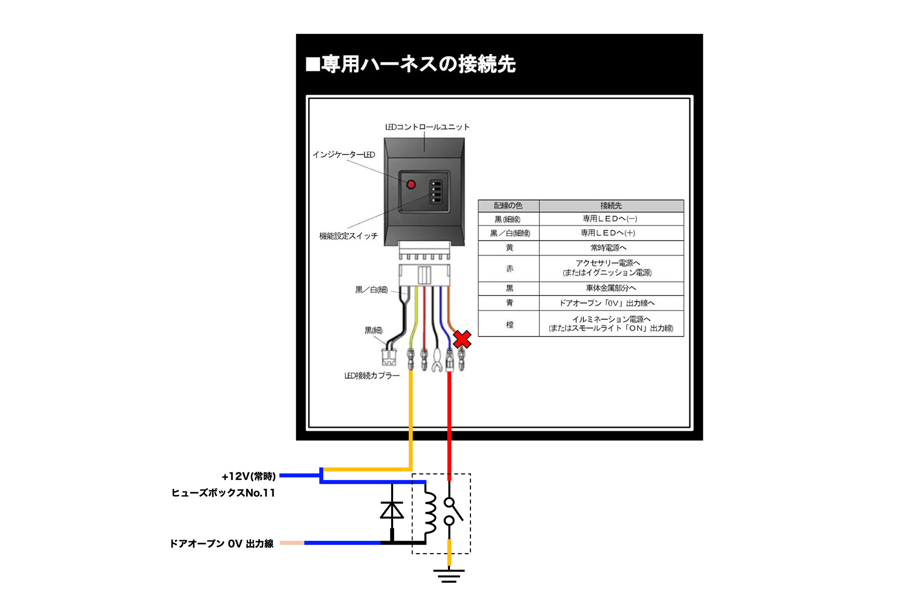 配線は上の図のような感じで、特に記載がないところも配線は行なっています。イルミネーション連動は不要かつ距離が長い(運転席側から助手席側に配線を持ってこなければならない)ので配線しません。今回の不具合はドアオープン線につながっているラインがなんらかの悪さをしているのではないかと予想しており、対応としては車両側の配線に整流ダイオードを挟むのが回路的には一番手軽です。